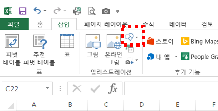 도형의 그리기의 위치 : [ 탭(삽입) - 리본 메뉴 "도형"]