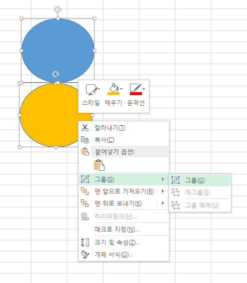 팝업 설정창이 뜨면 "그룹" 선택하여 두 개의 도형 그룹화가 가능합니다.